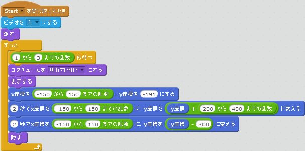 ○秒で座標を変えるブロックをつかってフルーツを動かしています。