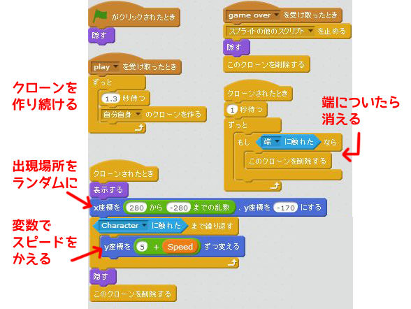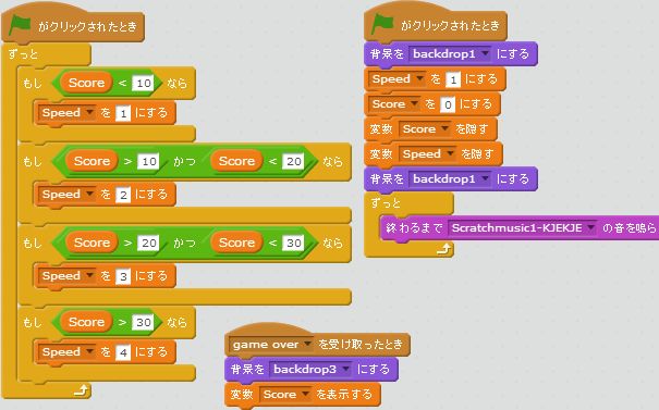 こんなかんじで、スコアに応じてスピード変数の中身を変えて