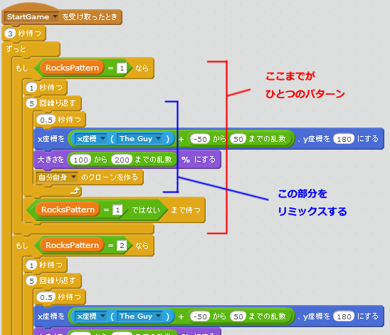 もし<RocksPattern(岩のパターン)=1>なら に囲まれた部分が