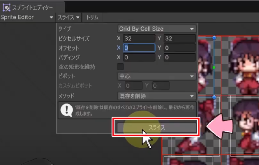 スプライトエディターで、32ピクセルごとにキャラチップを分割しましょう