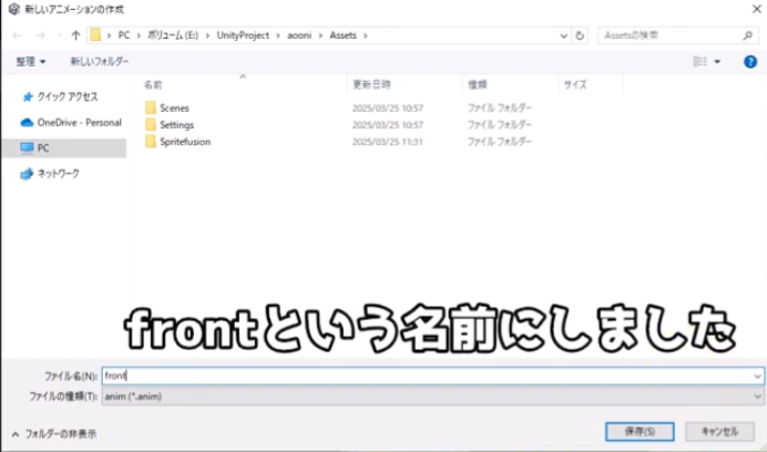 シーンにドラッグすると、アニメーションの名前を決めて保存する画面が現れます。