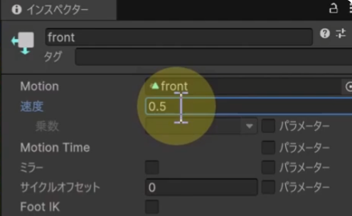このアニメーションは前向きのアニメーションなので、frontという名前にしました。
