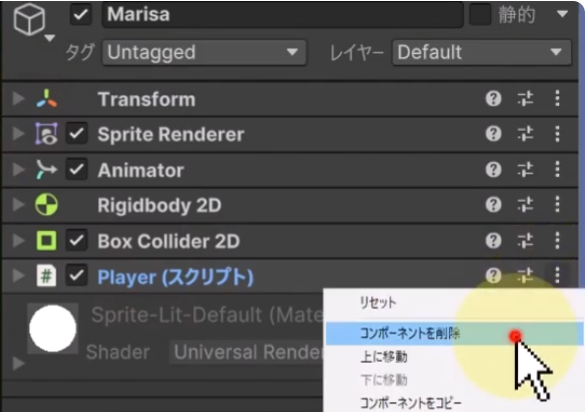 ヒエラルキーからプレイヤーのキャラクターをクリックし