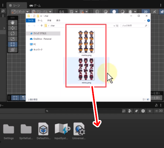 Assetsフォルダに保存できたら、プレイヤーに使う画像をクリックし