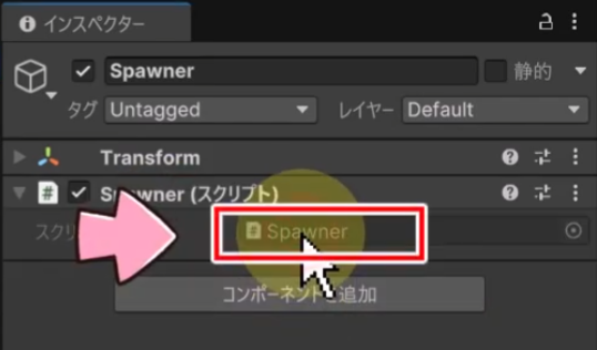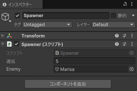 敵キャラクターが追いかけてくるスクリプトを追加しましょう。ヒエラルキーから敵キャラクターを選択し、インスペクターを開きます。