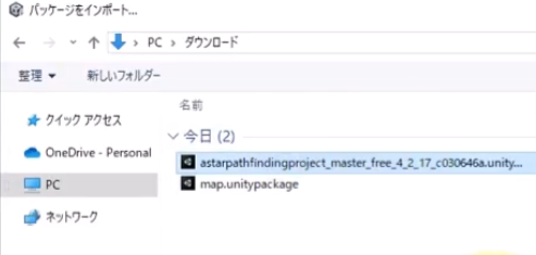 ダウンロードしておいた、astarpathfindingprojectのユニティーパッケージをえらびましょう。