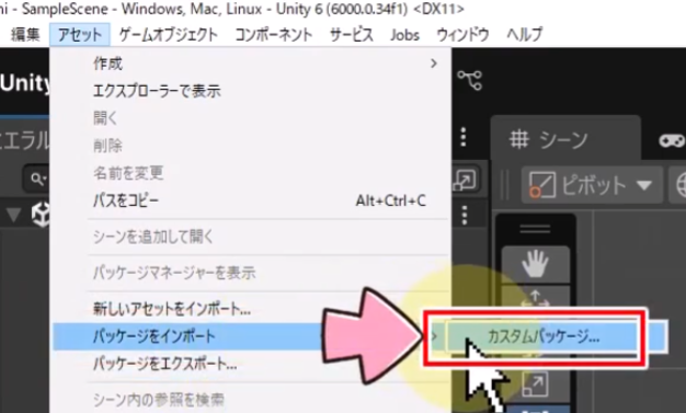 「アセット」→「パッケージをインポート」→「カスタムパッケージ」を選びます。