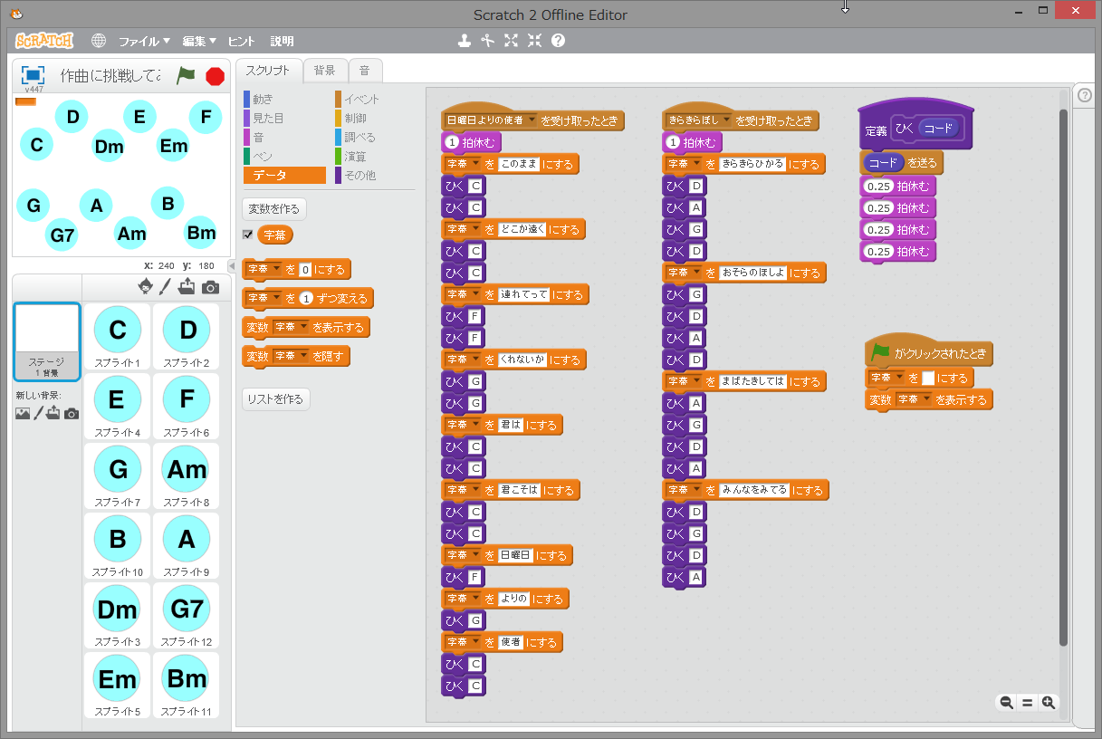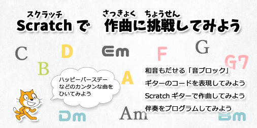 今回は、Scratchをつかってギターコードをひきつつ作曲してみよう!という