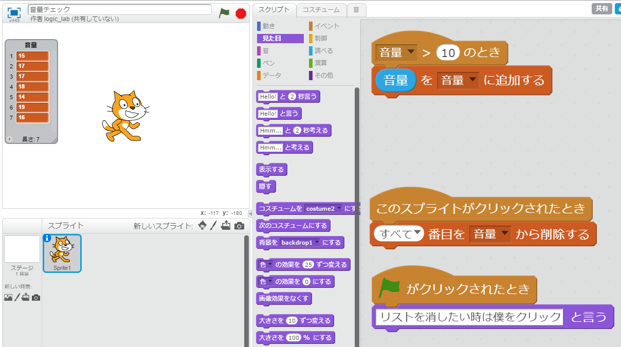 このタタコンでどれくらいの音を拾えているかScratchのプロジェクトを使って