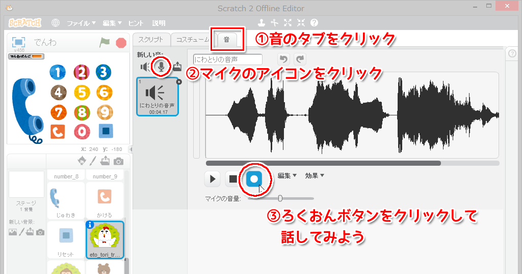 ろくおんボタンをクリックして、にわとりのセリフを話しましょう。