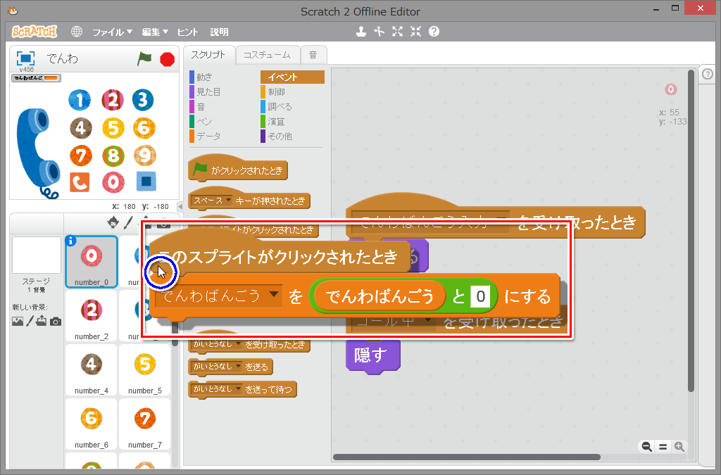 ドラッグするときは、マウスポインターがスプライトの上にのるようにするのがコツです。