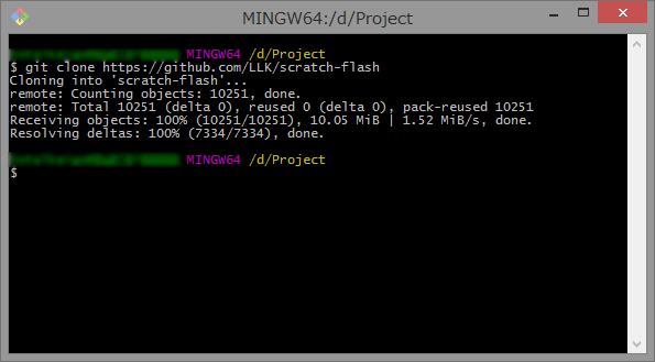 さて、さっそくGitでScratchのソースをダウンロードしてみましょう。まず、プロジェクトを作りたいフォルダをえらんで