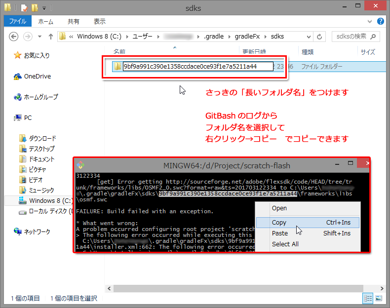 GitBashのログからフォルダ名をコピーして名前をつけましょう。