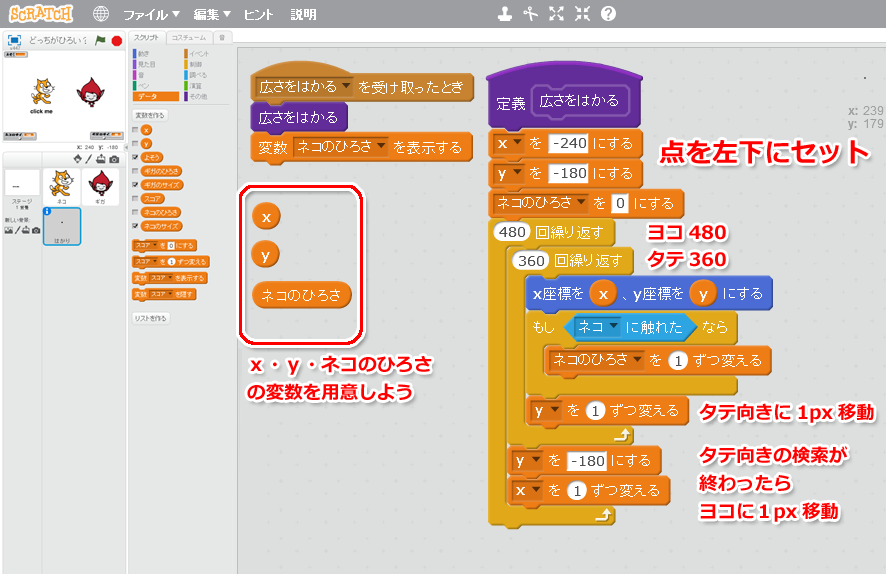 「x」「y」「ネコのひろさ」の